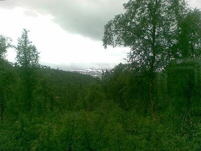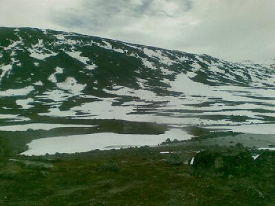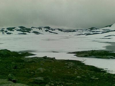 Maandag, 16.7: van zomer naar winter. We zitten op 960 meter hoogte in Sauvashytta. Het meer is nog bevroren. We waren hier om 15.00 uur. Genoeg tijd om uit te rusten en lekker te lezen. Morgen door naar Umbukta Fjellstova aan de E12.