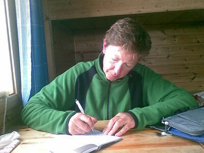 Janet schrijft voor de laatste keer in deze vakantie in het gastenboek.