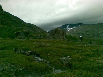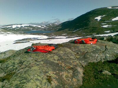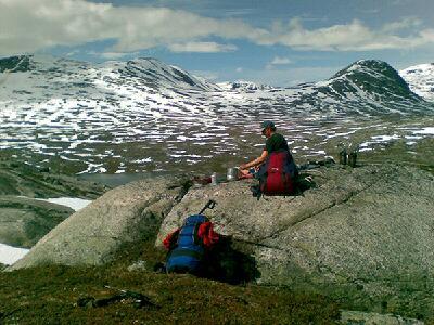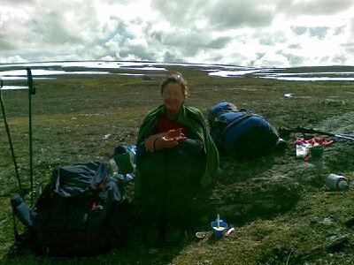 Dinsdag, 10 juli. De afgelopen en komende dagen lopen we in bekend terrein: Saltfjellet waar we in september '02 2 weken hebben doorgebracht met zus Jennie en zwager Dick. Toen liepen we echter van Z naar N. Goede herinneringen komen boven bij de diverse hutten: Balvass, Argalad en Trygvebu, waar we nu zijn.