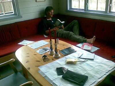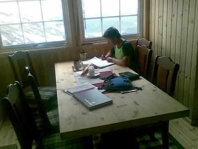 Geschreven zondag 15 juli. Vanwege de vroege start kwamen we ook vroeg in de middag aan bij Kvitsteindalstunet. Onderweg hebben we wat regen gehad en ook een kwartier voor we bij de hut waren plensde het er even heftig op los. Kort gezegd: wisselvallig weer. Vroeg in de hut betekent langere rust voor mijn inmiddels vermoeide voeten en dagboek bijwerken met de wandelkaarten erbij. Voor Gert verder lezen in een spannende zweedse krimi.